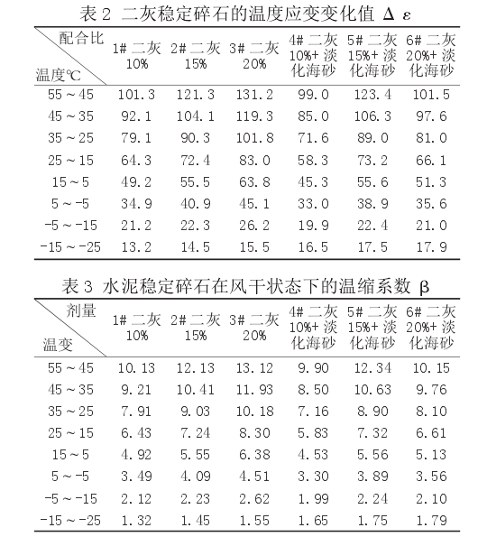 摻加淡化海砂二灰穩(wěn)定碎石的干縮應(yīng)變比二灰穩(wěn)定碎石干縮應(yīng)變小,主要原因在于加入淡化海砂后,減少了集料中礦粉的比例,集料的比表面積大大減少,從而減少了膠結(jié)材料的含量,因而干縮效應(yīng)減小;而另一方面,摻加淡化海砂的二灰穩(wěn)定碎石的溫縮系數(shù)也比二灰穩(wěn)定碎石小,其原因同樣是由于淡化海砂的替代了部分礦粉,粗集料的比例較大,集料的以嵌接一密實(shí)結(jié)構(gòu)存在,溫度穩(wěn)定性提高。